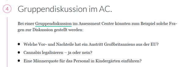 Sollte es jemals in einem deutschsprachigen Unternehmen eine Assessment-Center-Gruppendiskussion über die Legalisierung von Cannabis geben, wären wir bereit, die "Qualität" der Empfehlungen und Tipps anzuerkennen. Bis dahin ist "Fachwissen" dieser Qualitätsstufe aber völliger Unsinn, der Bewerberinnen und Bewerber im günstigsten Fall zum Schmunzeln bringt, uns aber eher Bauchschmerzen bereitet.